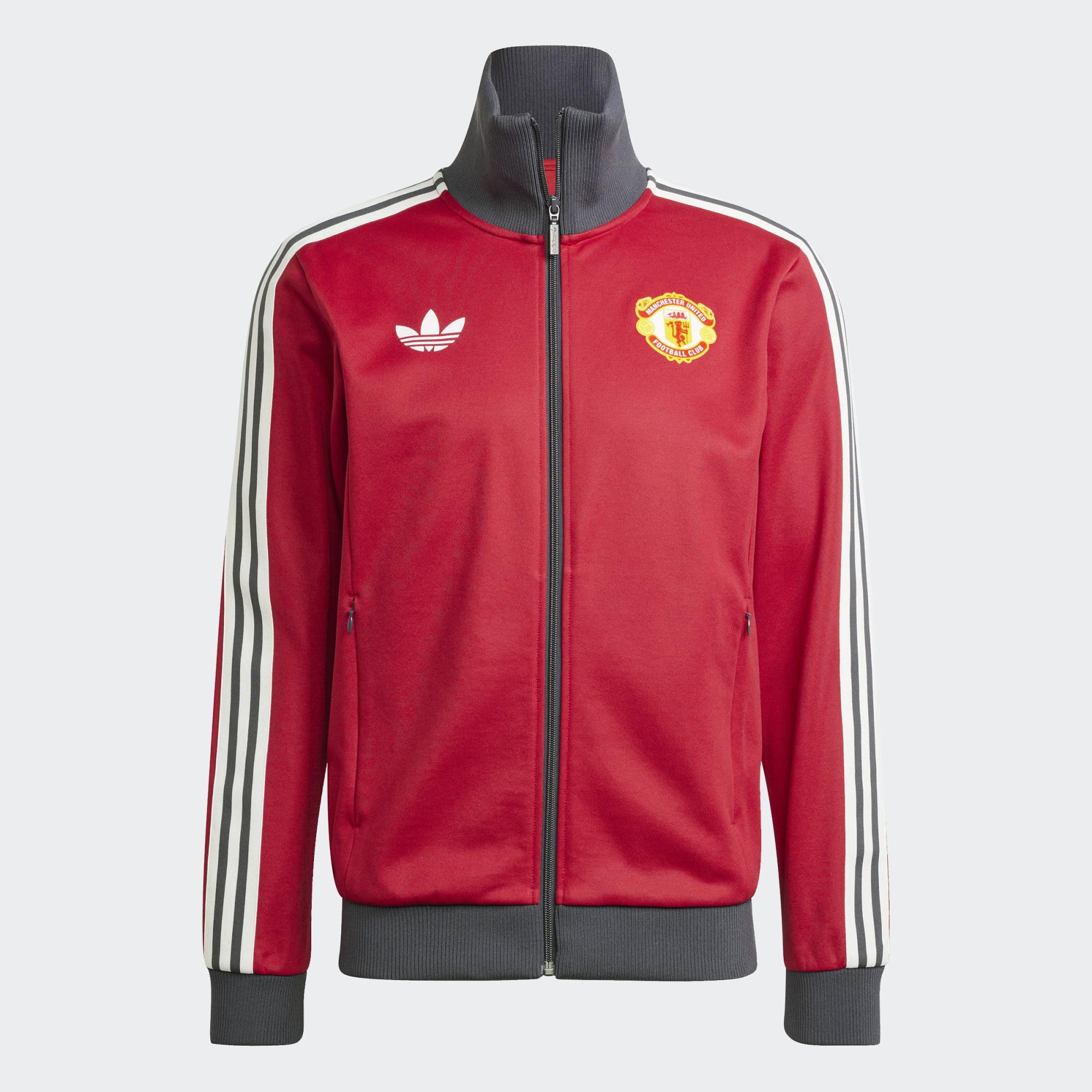 Sport a timeless look with the Manchester United Beckenbauer Track Top. This slim-fit, knit track top boasts a 52% CO/48% REC.PES composition, combining style and sustainability. Inspired by classics and reinvented for today's football culture, it features the Manchester United Club crest and adidas trefoil. Experience the sophistication of a wardrobe staple that balances innovation with respect for tradition.